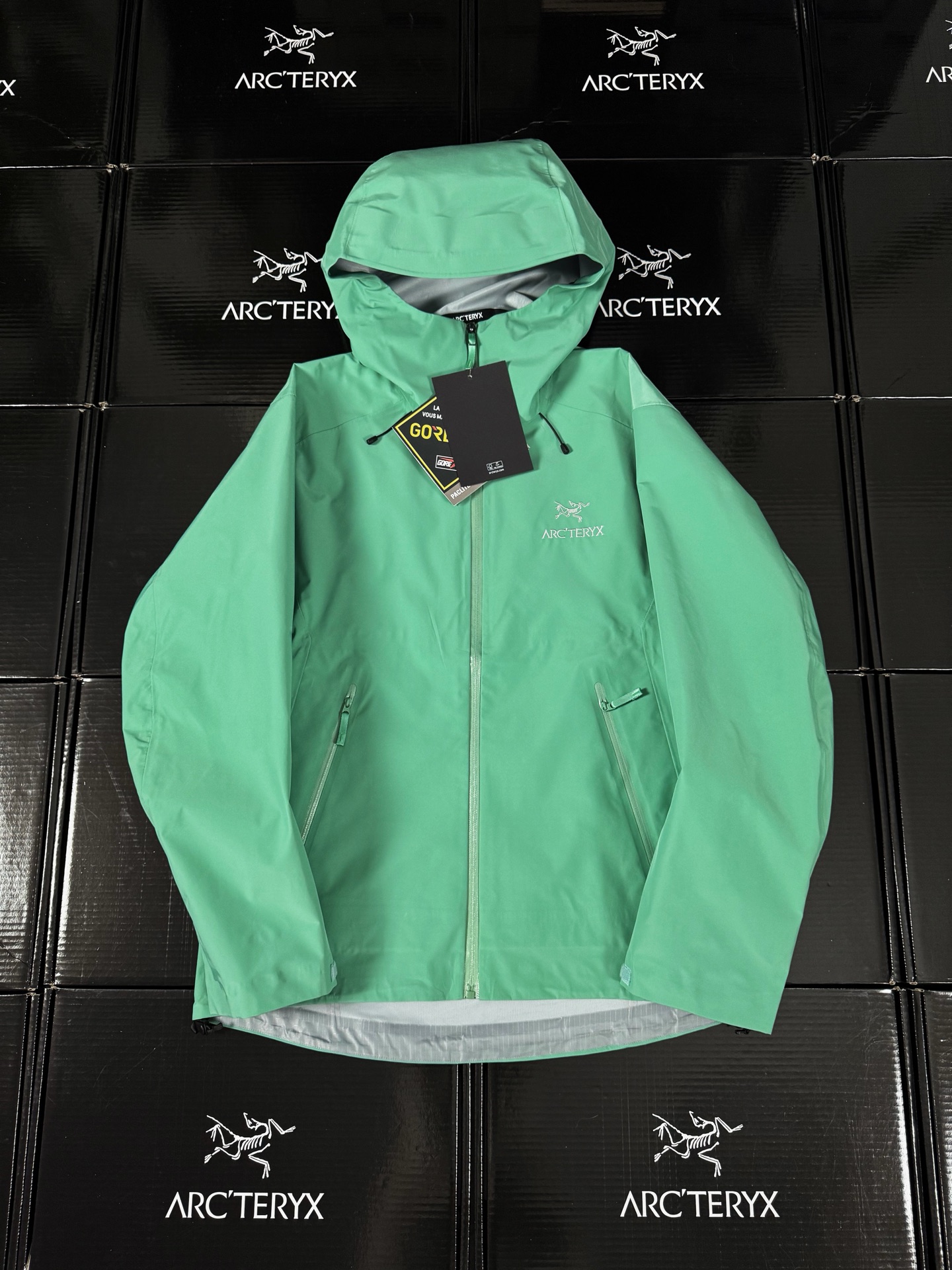 Traditional organ cross reverse access high mountain pocket set at a high position, VISLON central front zipper, adjustable Velcro cuff Velcro label, compatible with Zip in, with ARC TERYX logo embroidered on the chest using a Patel machine