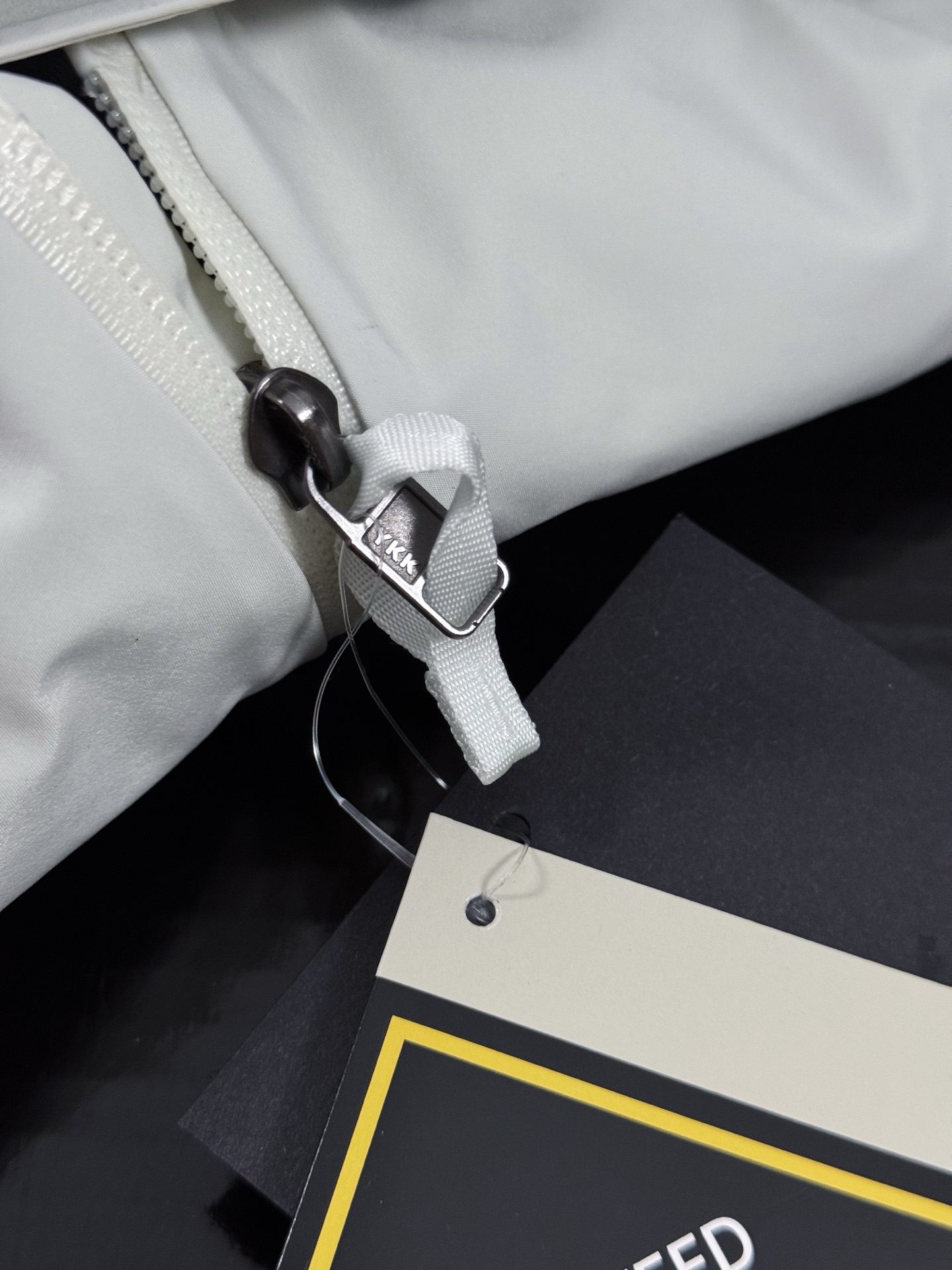 Traditional organ cross reverse access high mountain pocket set at a high position, VISLON central front zipper, adjustable Velcro cuff Velcro label, compatible with Zip in, with ARC TERYX logo embroidered on the chest using a Patel machine