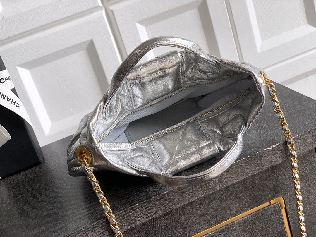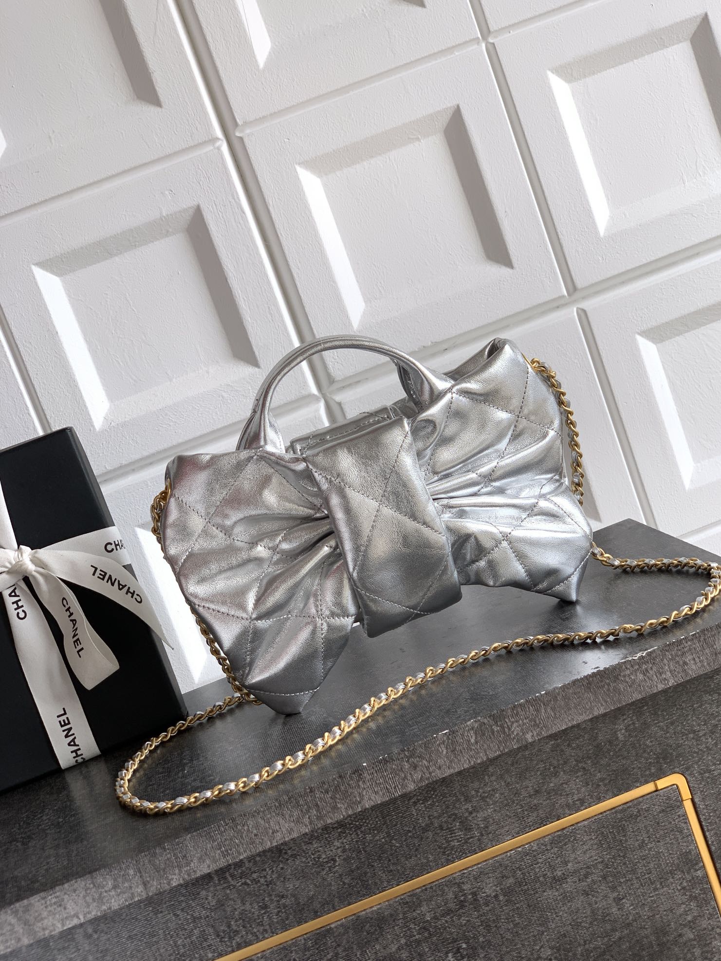Chanel 25k bow sheepskin Hand Bag silvery Small Size